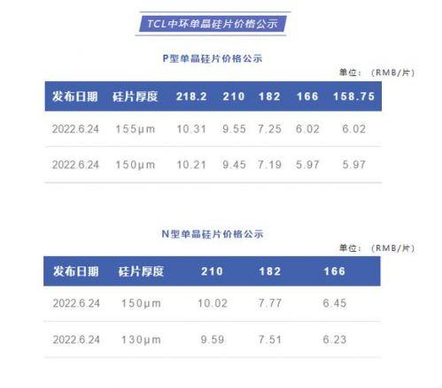 6月24日,TCL中环在其官微公示最新单晶硅片价格,N型及P型单晶硅片价格全面上调,不同规格价格上涨0.27-0.53元/片,涨幅在5%左右,自6月25日开始执行。