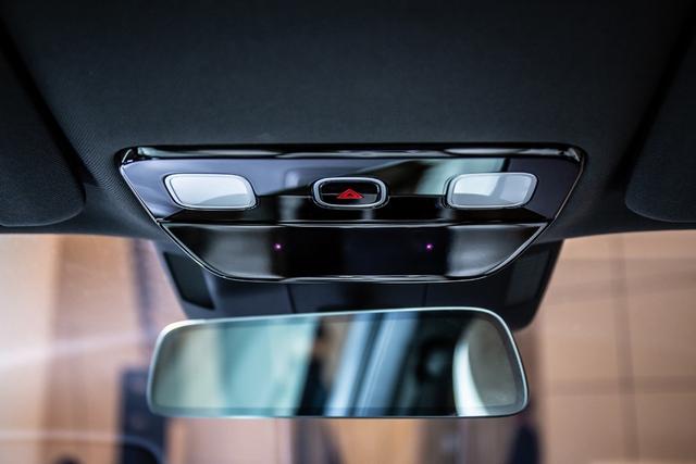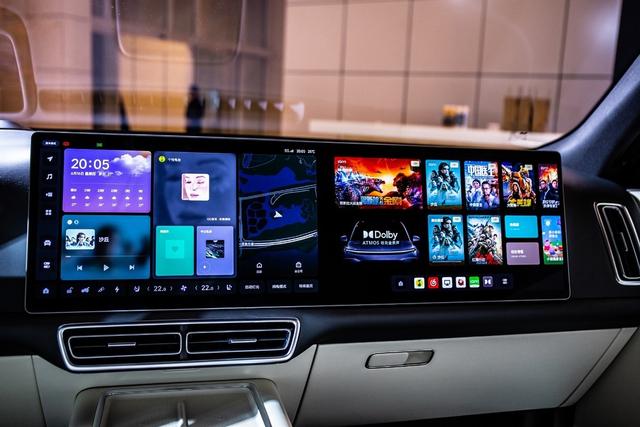 第二、三排乘客的影音娱乐体验,交由悬在车顶的电动折叠 15.7 英寸屏幕完成。全车三块 15.7 英寸的屏幕是互相打通的,内容共享只需长按内容卡片,再用屏幕手势一滑,搞定。