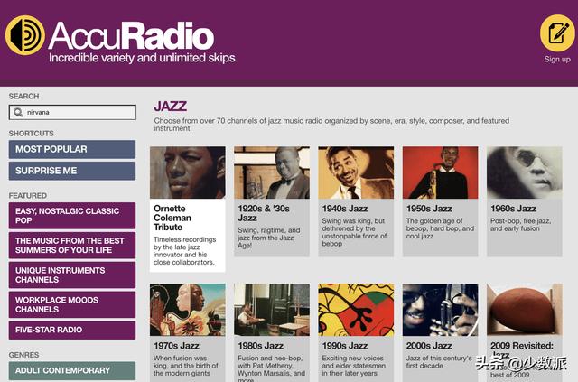 爵士乐我没有很认真地听,只是偶尔会在家里用做背景音乐。如果你喜欢爵士乐,可以试试 AccuRadio 的爵士频道,完全免费不废话,打开就是数之不尽的各种类型的爵士乐循环播。事实上 AccuRadio 是一个综合型网络电台,很适合平时就比较喜欢听歌单的同学。另一个选择是 JazzRadio,它的分类比较是「巴黎咖啡厅」、「甜美人声」这样的风格,曲库是很庞大的,不过相对而言就比较适合「心情向」听歌或是当作环境音乐。JazzRadio 说是说月费 40 美金,不然会有广告,但听下来好像免费也没什么影响。