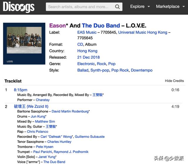 Discogs 最主要的功能是数据库,一般用于检索资料,包括词曲作者甚至细致到每一位制作人员的名字都会被展示。在这个越来越少人购买实体唱片的时代,这种级别的资料整理特别难能可贵。此外 Discogs 还提供社区和 CD 买卖,不过都是英文和海外卖家,运费也不便宜。