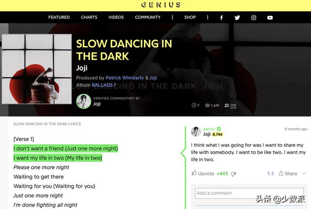 Genius 是一个查询歌词含义的工具型社区,你可以在上面看到某一句歌词的具体解读,而不仅仅是乐评人对于某一首歌或者唱片的笼统介绍。里面大部分解读都是乐迷自己提交的,信不信由你,不过偶尔也有有音乐人本尊现身(如下图)。