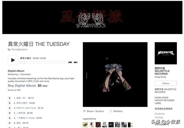 Bandcamp 大概是全球最知名的独立音乐平台。任何音乐人均可在上面发布和销售自己的音乐,用户可以完全免费试听,也可以付费下载或者购买实体周边。截至 2018 年 5 月,Bandcamp 上音乐人的创收总共达到了 2.96 亿美元。我最喜欢在上面买数字专辑,因为它的无损音乐文件均为音乐人提供,绝对货真价实。而且很多都价廉物美,比如下图这张我近年最喜欢的说唱专辑,竟然只售 5 块钱港币!