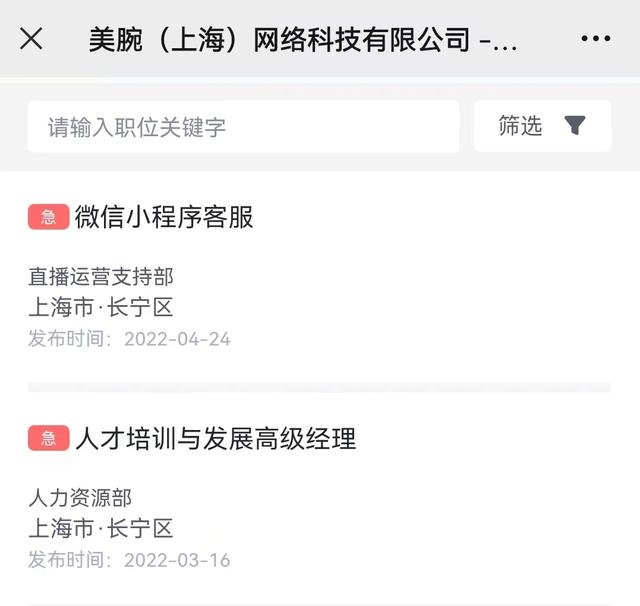 近日,李佳琦背后公司美One正在放开招聘岗位,其中微信小程序客服、人才培训与发展高级经理更是急招岗位。