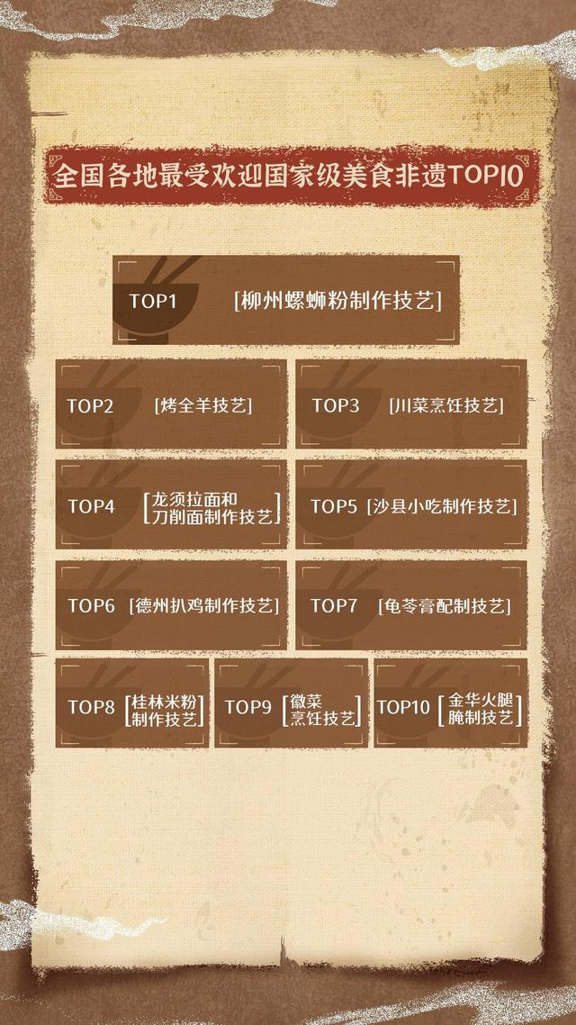 国家级非遗中的美食技艺也在抖音大放异彩,柳州螺蛳粉、烤全羊、川菜、龙须拉面和刀削面、沙县小吃、德州扒鸡、龟苓膏、桂林米粉、徽菜以及金华火腿等,占据了抖音网友喜爱的前10名榜单。