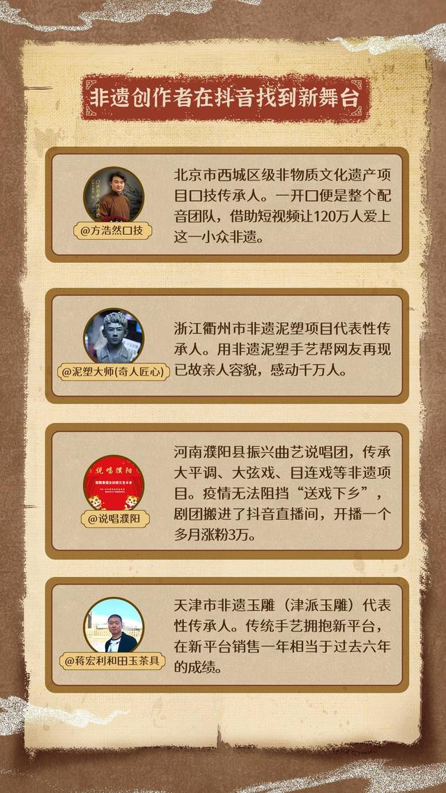 同样是抖音的资深创作者,濮阳县振兴曲艺说唱团的“说唱濮阳”,传承大平调、大弦戏、目连戏等非遗项目。疫情让他没法下乡演戏,他干脆把剧团搬进了抖音直播间,开播一个多月涨粉3万。天津市非遗玉雕(津派玉雕)代表性传承人蒋宏利,一直坚信传统手艺要拥抱新平台,他在抖音上一年的销售量,相当于过去六年的总数。
