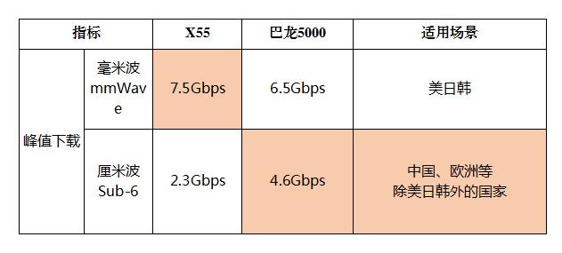相比华为巴龙5000,在毫米波频段最高达6.5Gbps,Sub-6GHz下行速度最高4.6Gbps。