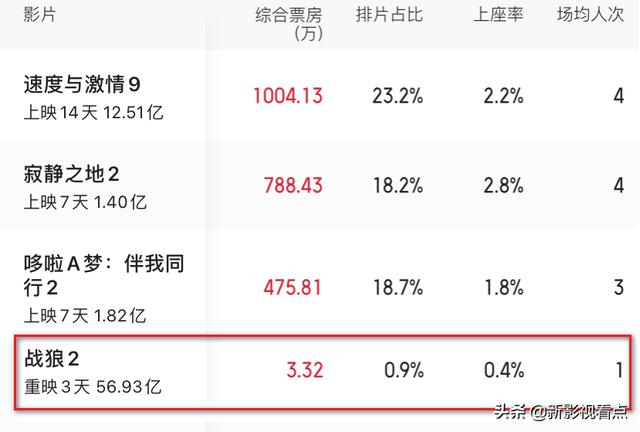 《战狼2》已经重映了3天,带来的重映票房仅为8.6万,排片量不足1%,上座率仅为0.4亿。目前,累计总票房达到了56.93亿,依旧有望破57亿,但这样的重映,已经让我们看到了该片的热度已退。