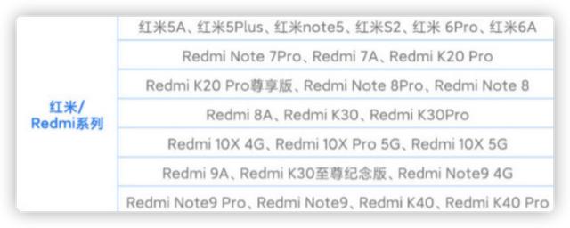 红米 Note7、红米 9、K30 5G、K30i、小米 8 透明探索版、小米 8 屏幕指纹透明版、小米 9 透明版、小米 10 Ultra 透明版。