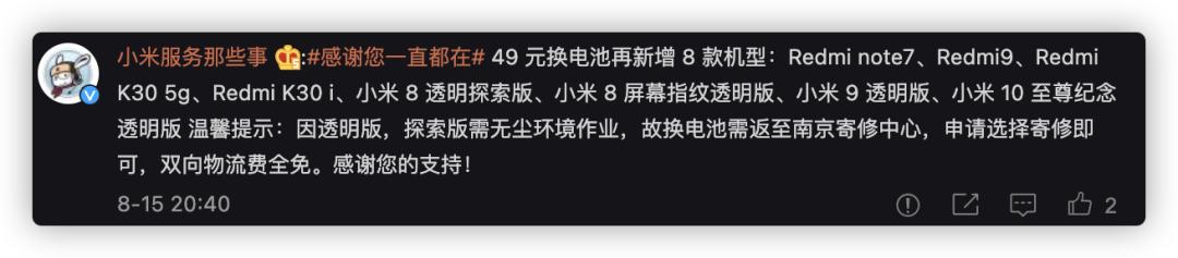因为反馈热烈,于是今天小米官方售后表示以下这些机型也可以享用 49 元换电池服务,包括: