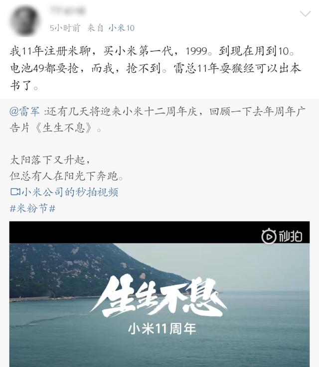非常值得一提的是,今天小米 CEO 雷军在个人微博发了一条关于小米 12 周年自己被一名米粉感动的微博,下方评论区第一个热评是“所以他换电池不用抢吧”,可谓是灵魂发问了。