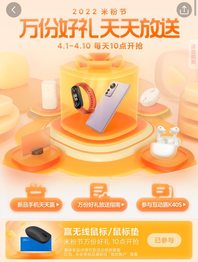 后者的「每天抢万份好礼」活动是从 4 月 1 日起至 4 月 10 日,用户可以进入活动页面抽奖,万份好礼将以优惠券或者购买资格形式抽奖获得,其中的优惠券包括 0.01 元优惠券和满减券,产品包括背包和 T 恤等小米周边、移动电源和充电器等手机配件、音箱等智能家居产品,以及小家电。
