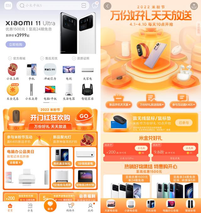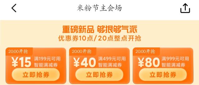 今年的米粉节活动内容除了常规的产品优惠之外,主要包括「整点抢优惠券」和「每天抢万份好礼」,前者是从 3 月 28 日起至 4 月 10 日每天都能抢 2 次优惠券,优惠券面额为 15 元、40 元和 80 元。