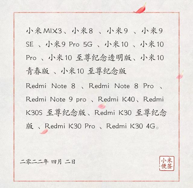 4 月 1 日 10 点是首次开抢的时间,数量共有 1 万份,这 1 万份是所有支持机型的累计数量,不同机型的数量不尽相同,比如小米MIX 3 为 2000 份,小米10 Pro 为 800 份,红米K30 Pro 为 500 份,详细明细如下图: