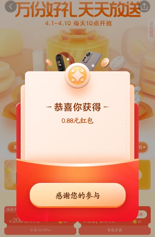 没有抽到优惠券的用户,还有机会获得 0.88 元现金红包和 10 米金。