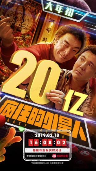 根据猫眼专业版数据,截止至2月18日16点,万众瞩目的2019年春节档电影《疯狂的外星人》总票房正式突破20亿大关,成为中国影史第15部破20亿电影。