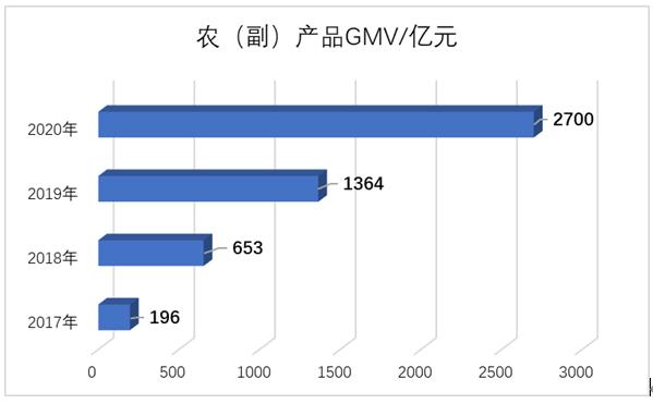 在“农地云拼”的助推下,从2017年—2020年,拼多多农(副)产品GMV分别达到196亿元、653亿元、1364亿元、2700亿元的规模,农产品上行货量保持三位数的高速增长。2021年第一季度,拼多多农产品订单同比暴增300%,单品销量超过10万单的农产品高达2600款。依靠农产品发家的拼多多,已成为国内最大农产品上行平台。