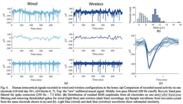 研究人员还通过实验,将在家庭环境中使用无线脑机接口系统与有线系统的效果做了比较,发现两种方法对神经信号质量的影响微乎其微。