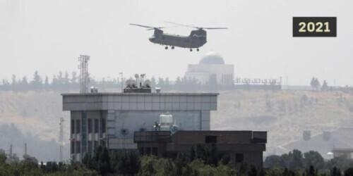 2021年8月15日清晨,美军CH-47“支奴干”双旋翼直升机飞抵美国驻阿富汗大使馆上空,撤离美方工作人员。