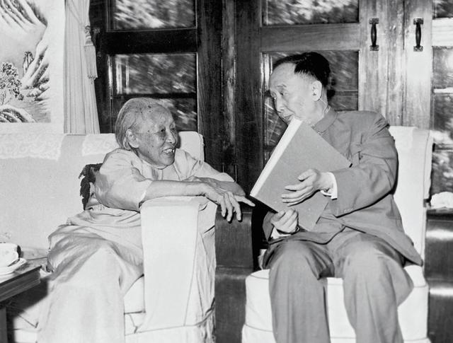 郭沫若和何香凝在一起研究书画。