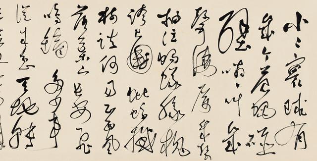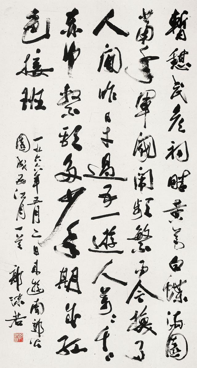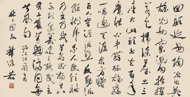 1949年建国前,经过10多年的敌后斗争的风云激荡和战争洗礼,他在创作大量震动文坛的文学作品、振臂为国民鼓呼的同时,激情奔流中也完成了作为书法家个性语言形象的熔铸和塑造。作为一个一生致力于国家独立、民族解放的文化战士,中国现代文学的领军人物,建国后他担任国家方面的领导,获得了高度的荣誉和地位。应该说,“书为心画”,一个艺术家的作品就是他的内在精神世界的外化。不同艺术样式有不同艺术媒介、载体,但在精神上必然息息相通,并在他作品中显示出一致的痕迹。实际也是如此。我们看1950年以后的作品,作者除了保持原有的充满热情、矫健飘逸的行书风格外,大开大合、激情澎湃的张旭、怀素式 “大草连带语言”增加了。这些作品行草结合,笔意连绵,团团环绕中,时见率笔纵放,笔墨烂漫。这反映了作者在书法与情感表现的技术上,有进一步深入的探索;在技巧驾驭上,也更趋于纯熟。蜚声海内外的“郭体”书法,也就是在这一时期,伴随着人们对文化前辈、巨匠的敬仰,在全国开始流行,并拥有众多的追随者。