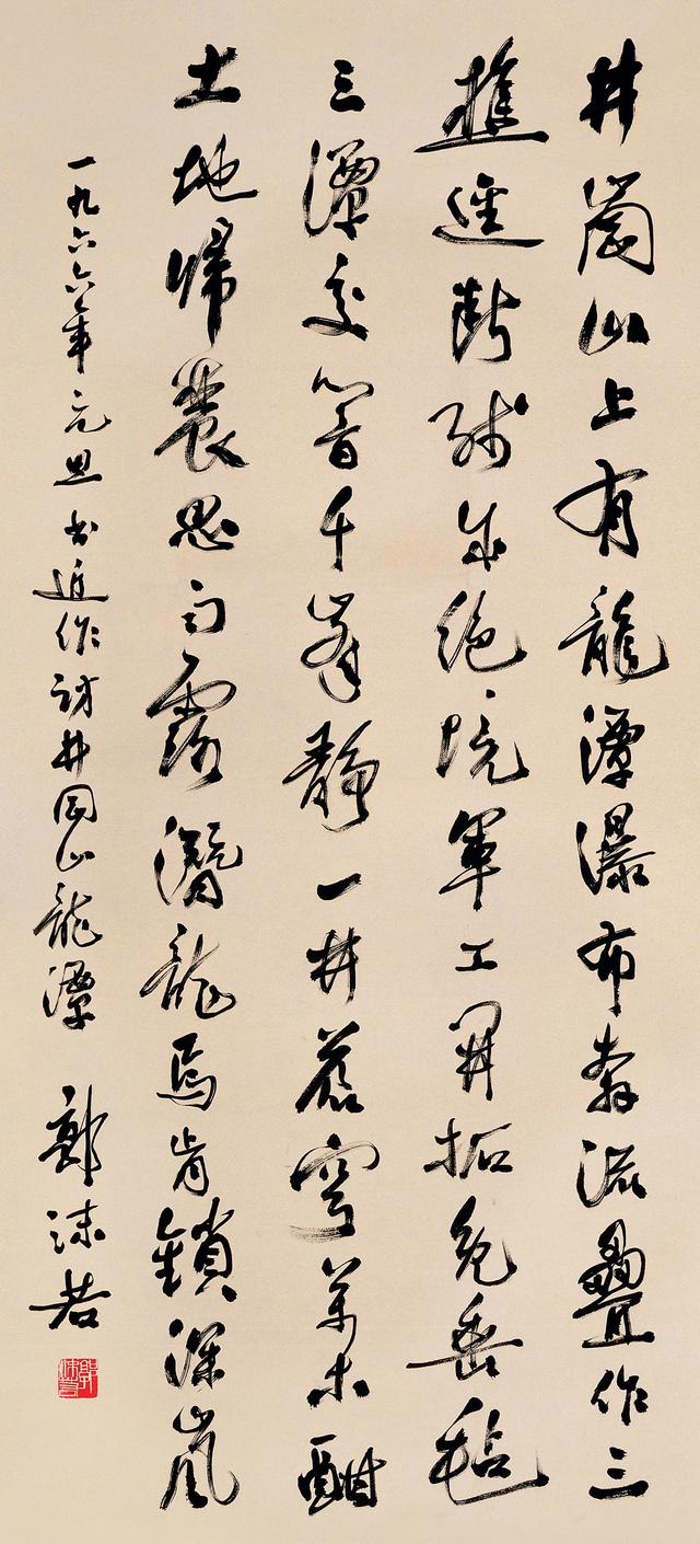 郭沫若 行书 访井冈山龙潭 纸本 1966年 释文:井冈山上有龙潭,瀑布奔流叠作三。樵径断残成绝境,军工开拓免垂毡。三潭交响千峰静,一井苍穹万木酣。土地归农思雨露,潜龙焉肯锁深岚。一九六六年元旦,书近作访井冈山龙潭,郭沫若。 钤印:郭沫若(白)