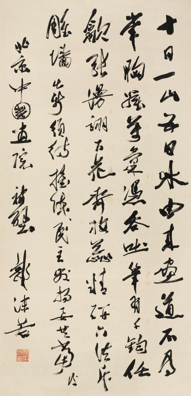 郭沫若 行书 题北京中国画院 纸本 1957年释文:十日一山五日水,由来画道不寻常。胸罗万汇凭吞吐,笔有千钧任歙张。漫诩百花齐放蕊,精研六法斥雕墙。出新须待推陈后,民主发扬要共当。北京中国画院补壁,郭沫若。钤印:郭沫若印(白)