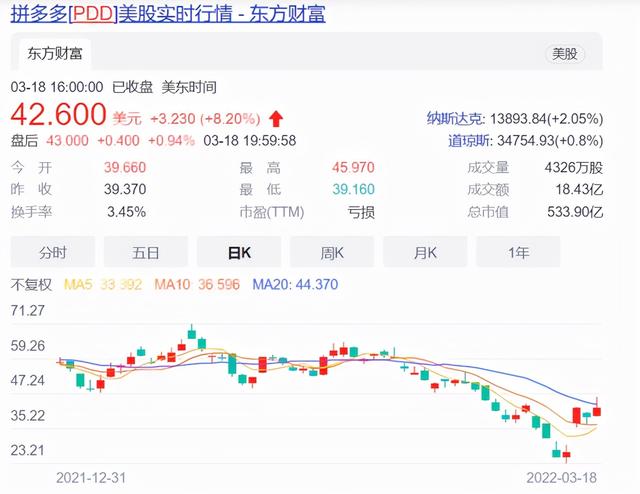 拼多多的市值是经常大起大落的,截止到2022年3月19日,拼多多的市值仍然有533亿 刀 ,在8个已经上市的中国互联网巨头中,拼多多仍然是第四位。