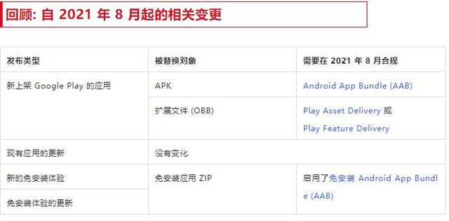 为了让更多用户体验到这些优势,并专注推广对所有开发者有益的现代 Android 分发技术,自 2021 年 8 月起,Google Play 将开始要求新应用使用 Android App Bundle 进行发布,该格式将取代 APK 作为标准发布格式。