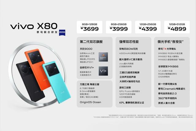 至于产品卖点上,vivo X系列一直都是影像旗舰,包括拍照和视频,这代产品也不例外。其实今年的手机给人一种感觉,那就是对于性能已经很难让人提起兴趣了。vivo这次给手机搭配了规格不错的摄像头组合,X80 Pro配备了1/1.3英寸大底GNV CMOS,X80也配备了IMX866作为主摄。另外值得一提的是,这次全系标配了vivo V1+作为影像功能的辅助芯片,但它又不是独立的ISP。