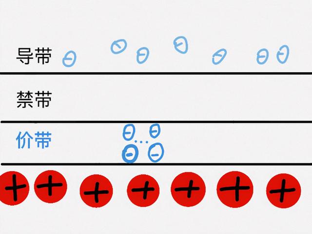 这样的话,我们可以给电子们划分两个活动区域:一是离原子核比较近的区域,这里的电子都被紧紧吸住,我们称之为价带。二是远离原子核的区域,这里的电子不受监管,比较自由,如果有外加电场让这些电子跑起来,那材料就导电了,我们称这个区域为导带。