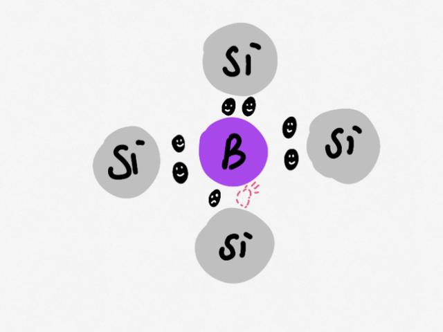 相反,我们如果掺入硼原子,它有5个电子,最外层有3个。硼原子和周围的硅原子凑,也只能凑出7个电子。这7个电子还差一个电子形成稳定结构,因此这里产生了一个“空穴”。我们称之为P型半导体,P(Positive)表示空穴可以等效成带正电的微粒。
