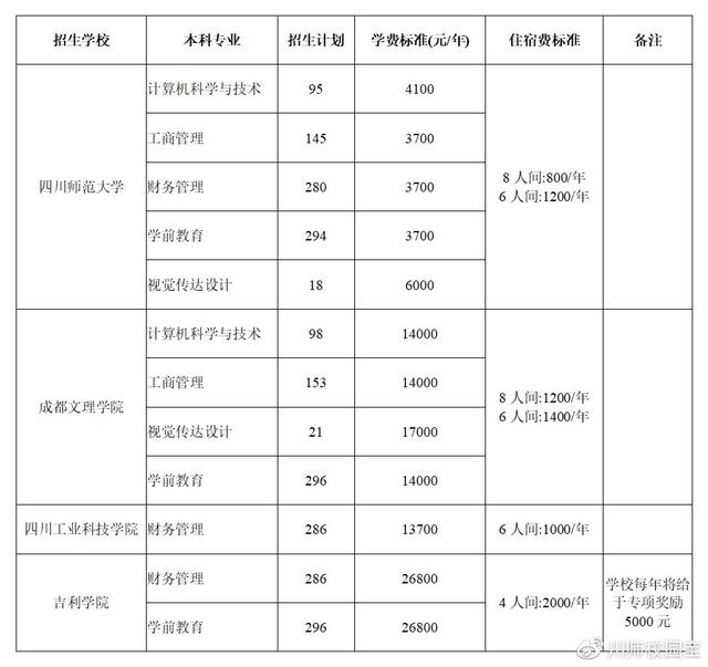 本年度我校“专升本”招生模式为与成都文理学院、四川工业科技学院、吉利学院三所民办本科院校组成招生联盟联合招生。除计划单列招收的退役士兵、建档立卡贫困学生由我校录取和培养外,其他类别50%的计划由我校录取(录取人数比例计算涉及到小数时只取整数,包括推荐免试学生),其余50%的计划根据学生志愿调剂到其余三所联合招生民办本科院校录取。