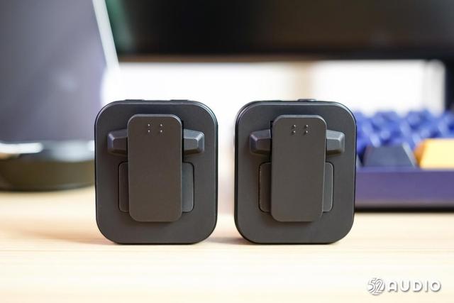 接收器和发射器背面一览,领夹也采用了亚光设计,整体呈现金属的质感。顶部设有小凸点方便用手指使用时增加摩擦力。