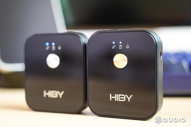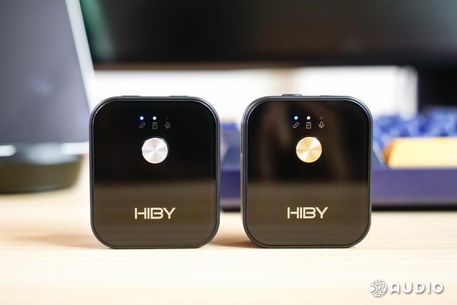 HiBy海贝MC1无线领夹麦克风外观一览。发射器和接收器在外观上均采用了圆角方形的设计,正面使用亮面塑料盖板增加质感,设有金、银两色的多功能按键用于区分设备,连接情况、电量、麦克风状态等3个工作指示灯。