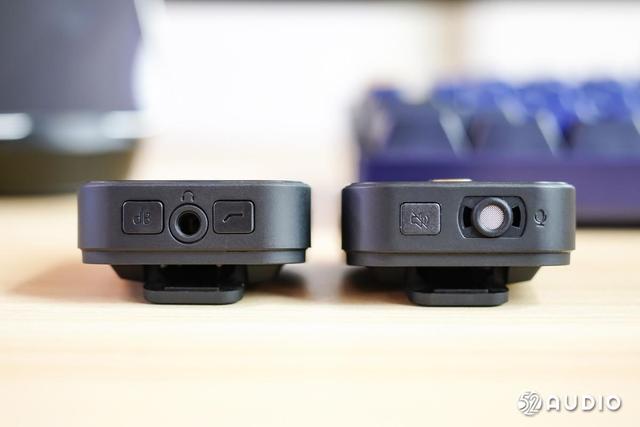 接收器顶部自左向右依次为:音量键、耳机监听接口以及降噪按键;发射器顶部自作向右依次为:静音键以及麦克风。在小机身上采用大按键的设计,方便使用。