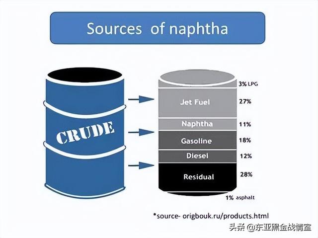 I原油一次加工蒸馏产生的:这一部分根据原油本身品质的不同,品质差的原油对石脑油的收率2-3%,中等的收率20%-30%,特种收率能达到60%-70%。这部分叫直馏石脑油。