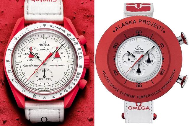 这次的MoonSwatch火星款,完美复刻了当年欧米茄超霸“阿拉斯加”的外形,白盘红针以及两个子盘的设计简直一模一样,连超霸“阿拉斯加计划”腕表配置的白色维可牢(Velcro)尼龙表带也完全一样。