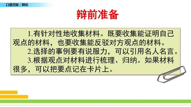 3.辩论前要有针对性地收集材料,既要收集能证明自己观点的材料,