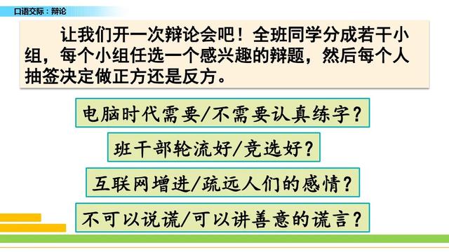 1.全班一起确定辩论话题,依据自己的认识选择正方或反方,也可以