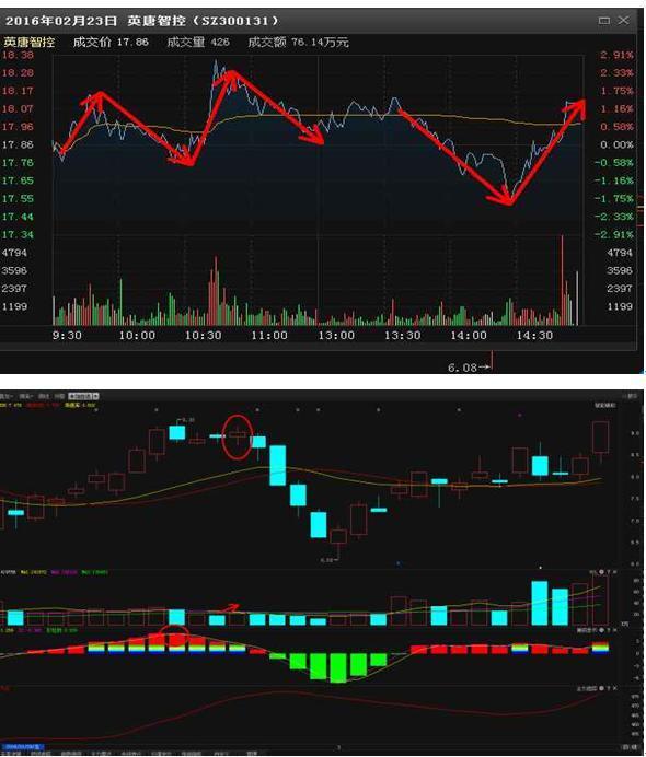 10、高位震荡做空:当个股运行到相对高位时,股价在均价线附近进行震荡,均价线多次被跌破,分时图出现顶部特征,全天量能比较活跃,说明市场出现反转的可能加大。下图是2月23日英唐智控的分时图和K线走势,股价低开后在均价线附近运行,3次跌破均价线,出现M头,全天量能放大,同时K线离智能辅助线有一定的距离,捕捞季节处于死叉区域,横盘滞涨4天,随后股价出现大幅下跌。
