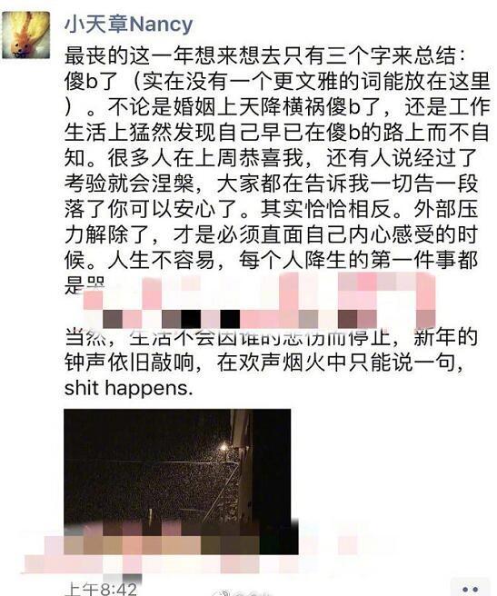 2019年元旦当天,有媒体爆出疑似章泽天朋友圈的一则跨年总结,内容多以自嘲为主,并爆出脏口,称过去一年为“最丧的一年”,婚姻、工作等都更没有文雅的词可以总结。此消息一度登上热搜首位,并再次引发离婚猜疑。