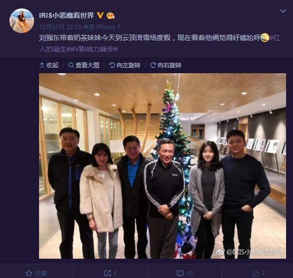 直到圣诞节当天,有网友发现章泽天与刘强东现身云顶滑雪场。他在微博中称:“刘强东带着奶茶妹妹今天到云顶滑雪场度假,现在看着他俩觉得好尴尬呀。”