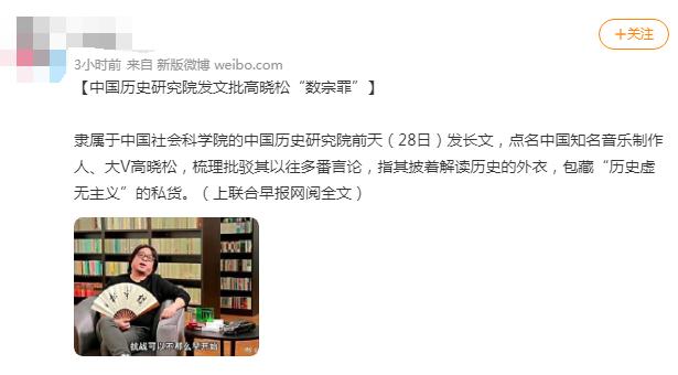 此前,历史研究院发文批判高晓松的“数宗罪”,怕是跟这次突然封杀息息相关。
