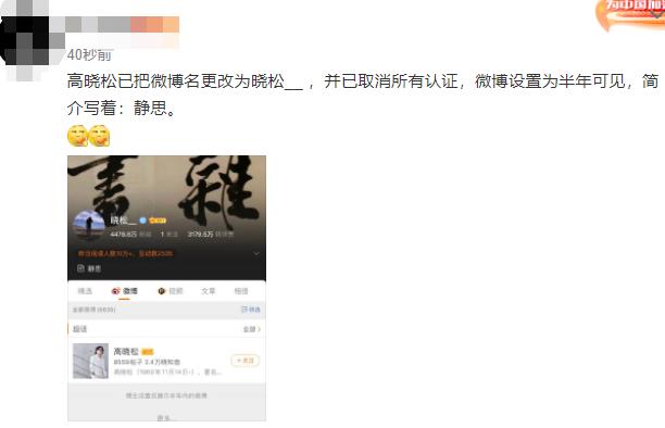 他更改了微博名字,从之前的高晓松改为“晓松—”。并已取消所有认证,微博设置半年可见,而在近半年的动态已经被他删光。