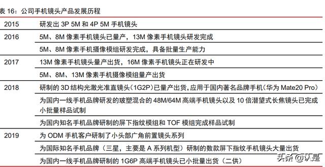 公司业务发展:顺应行业趋势,一体化布局手机镜头+影像模组。公司手机光学业务 发展初期以镜头为主,2015 年公司研发出 3P-5M、4P-5M 手机镜头,2016 年 5M、8M 手机镜头实现量产,2017 年 13M 手机镜头实现量产出货;2018 年公司为国内一线手机品 牌研发的玻塑混合的 48M/64M高端手机镜头以及 10 倍潜望式长焦镜头完成小批量样品试 制,同年研制的 3D 结构光激光准直镜头(1G2P)量产出货,应用于 H 客户高端机型; 2019 年公司为国内一线手机品牌研制的 1G6P 高端手机镜头小批量出货(二供),数款屏 下指纹镜头大量出货 S 客户。公司 1G6P 产品良率超 40%,高于友商 7P、8P 产品。为促 进镜头业务的发展,公司于 2017 年起开展手机影像模组业务。2017 年公司 5M、8M、13M 像素手机影像模组量产出货,2018 年为国内知名手机品牌研制的屏下指纹模组和 TOF 模 组完成样品试制,目前公司具备 FF、AF、OIS、双摄以及三摄模组的生产能力。我们认 为,公司手机影像模组业务有望与镜头业务产生良好的协同效应,在为客户提供完整光学 解决方案的同时反哺镜头业务,进一步增强公司模造技术在产业链上的影响力。