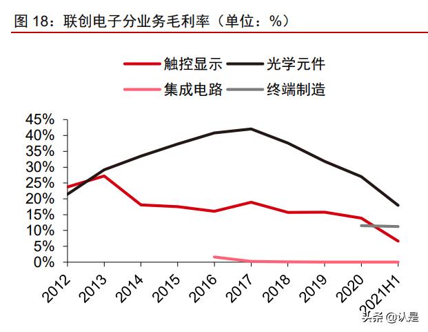 分业务看,(1)光学业务:2017 年以前,受益于高清广角镜头等高毛利率产品占比 提升,光学业务毛利率持续提升。为促进镜头业务的销售,公司于 2017 年开始陆续投产 影像模组产品,随着模组产品出货占比增加,近年来公司光学业务毛利率已连续下降,2020 及 2021H1 公司光学元件毛利率分别为 26.98%/17.96%,我们预计后续随产品结构优化, 毛利率有望逐步上升;(2)触控显示业务:由于触控显示一体化产品的主要原材料显示模 组大部分外购,触控显示一体化产品毛利率低于触摸屏。受触控显示一体化产品占比提升 影响(占比由 2013 年 11.49%提升至 2014 年 51.99%),2014 年板块毛利率同比-9.09%。 此后板块毛利率处于 15%-19%的区间,总体保持稳定。近年来触控显示业务毛利率整体 呈现下降趋势,2020/2021H1 分别为约 13.90%/6.66%,主要系市场竞争加剧叠加成熟产 品价格下降所致。随公司提升生产效率和产品良率,我们预计后续触控显示产品毛利率有 望筑底回升;(3)集成电路业务:近年几乎未实现盈利,2020/2021H1 毛利率分别为 0%/0%, 考虑到该业务的贸易属性,我们预计后续该业务利润贡献仍较有限;(4)终端制造:2020 年及 2021H1 毛利率分别为 11.52%/11.27%,预计后续盈利能力稳定。