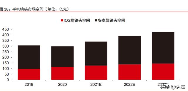 多摄、3D 等驱动,预计 2021/2022/2023 年手机镜头市场 340/390/420 亿元。对于镜 头厂商而言,2020 年新冠疫情影响虽恐使终端厂商出货量呈现双位数下滑,但我们认为 疫情只是暂缓了行业升级趋势而非中断,疫情趋缓后,微创新仍将为行业带来一定增量。 3DSensing 带来的前置结构光(发射端镜头+接收端镜头)、前置 TOF(接收端镜头)和后 置 TOF(接收端镜头)有望放量,叠加高像素、潜望等镜头规格提升带来 ASP 提升。智 研咨询预计 2021 年单机平均摄像头搭载量达约 3.7 颗,同时我们预计在镜头规格逐步升 级的趋势下,安卓端主摄镜头的 ASP 将达到 10 元+。据此,我们测算安卓端镜头的市场 空间将达到 210 亿元。在此基础上考虑 iOS 端空间,我们测算 2021/2022/2023 年手机镜 头市场空间分别为 340/390/420 亿元。(报告来源:未来智库)