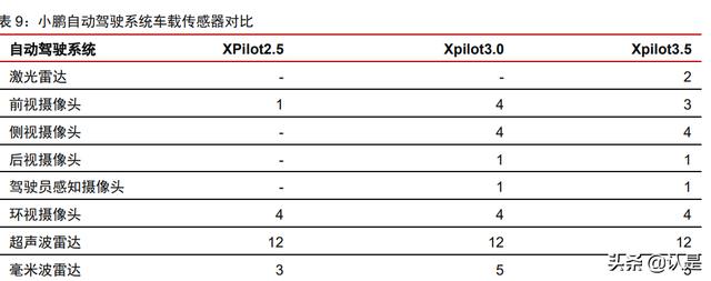 ——新能源汽车为 ADAS 领头羊,特斯拉、蔚来、小鹏等新势力自动驾驶级别已经 达到 L3+,单车摄像头用量普遍超过 10 颗。相较于传统汽车的内燃机,新能源汽车通过 电动机控制电压、电流的输入输出,几乎可实现瞬时响应指令,更适应于自动驾驶对执行 层反应速度的要求。近年来造车新势力基于纯电动平台纷纷推出并快速升级智能驾驶系统, 如特斯拉将 Autopilot1.0 升级到 2.0、蔚来将 Nio Pilot 升级到 NAD(Nio Autonomous Driving)、小鹏将 Xpilot2.5 升级到 3.5 等。新能源汽车作为汽车智能化领头羊,自动驾驶 级别领先行业,以小鹏为例,2018 年发布的小鹏 G3 搭载 XPilot2.5 辅助驾驶系统,配备5 颗摄像头;2020 年上市的小鹏 P7 搭载 XPilot3.0 辅助驾驶系统,摄像头使用量上升至 14 颗;2021 年发布的小鹏 P5 搭载 XPilot3.5 辅助驾驶系统,使用 2 颗激光雷达替代 1 颗 前置摄像头,摄像头数量仍然高达 13 颗。