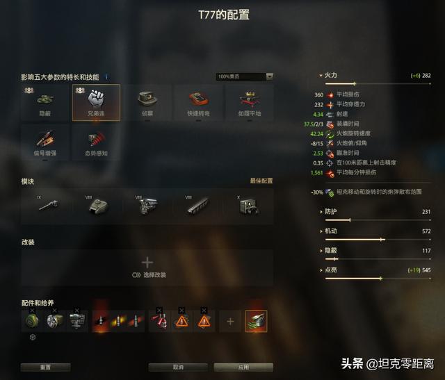 配件上小编推荐垂稳—改进型传动装置(小垂稳)—通风的组合,大小垂稳用来压住脸盆一样大的扩圈,小垂稳还能让整车更灵活;而通风能强化下各方面的数据;当然像加血,甚至是涡轮都可以上,加血可以多抗一炮伤害,而上涡轮极速甚至能到53,开局当别的重坦还在慢慢蹭的时候,T77直接弹射起步冲出去了。
