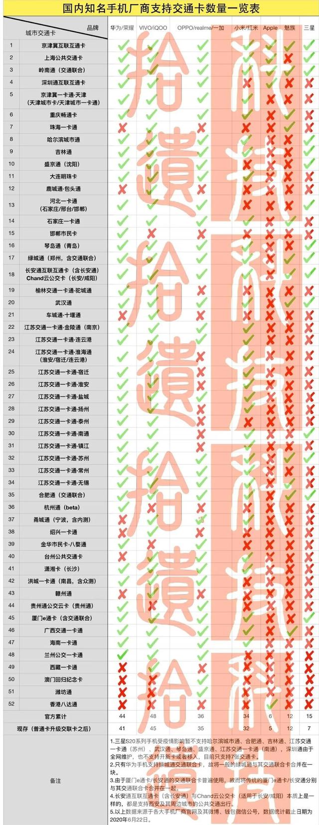 其中由于深圳通普卡已经停止更新维护而不能开卡,实际能用的只有14张。其中今年的三星旗舰S20系列由于疫情的关系目前仅支持7张交通卡,比魅族17系列还要惨!!!